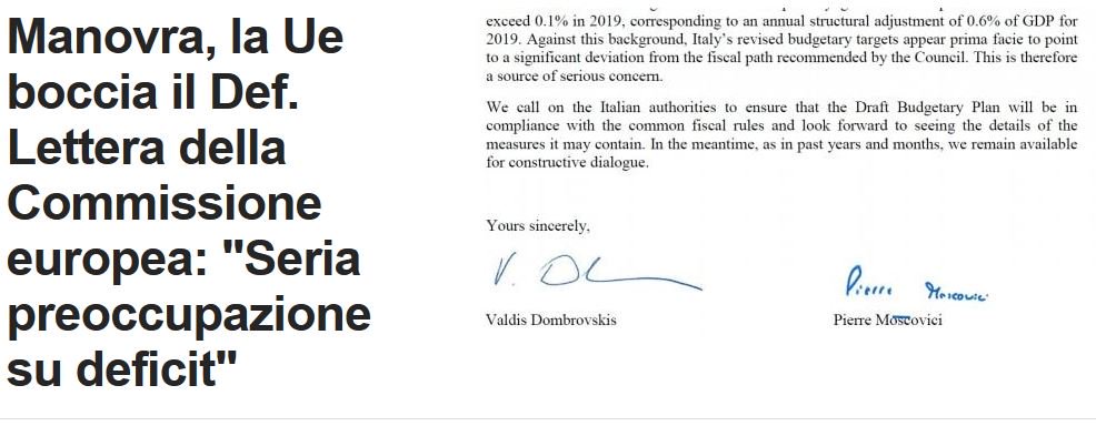 Έτσι, σε επιστολή-απάντηση προς τον Giovanni Tria, η Ευρωπαϊκή Επιτροπή μετά από ημέρες αντιπαράθεσης, με μια πρώτη επίσημη πράξη υποδεικνύει στους κκ. Di Maio και Salvini ότι η χρηματοδότηση του ελλείμματος στο εισόδημα των πολιτών και η σταθερή φορολογία είναι αντίθετη προς τους κανόνες του Συμφώνου Σταθερότητας.