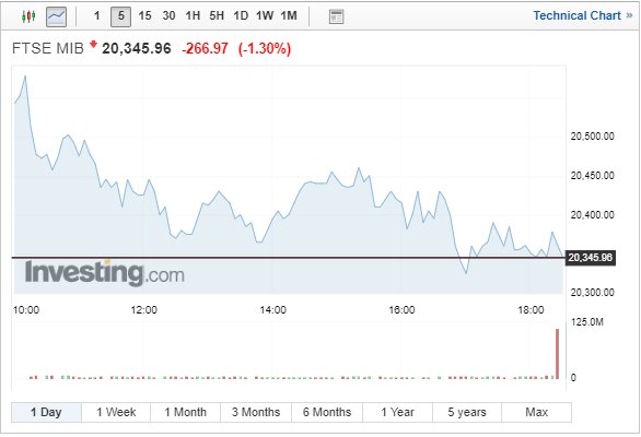Ο FTSE MIB στο Μιλάνο διολίσθησε κατά 1,30% κι έκλεισε στις 20.345,96 μονάδες, με τις μετοχές των ιταλικών τραπεζών να δέχονται ισχυρές πιέσεις.