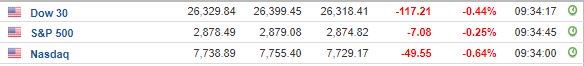 Περί τις 16:30, ο Dow Jones υποχωρεί κατά 0,3% στις 26.358 μονάδες, ο S&P 500 σημειώνει πτώση 0,2% στις 2.879 μονάδες, ενώ ο Nasdaq κινείται κατά 0,5% χαμηλότερα στις 7.749 μονάδες.