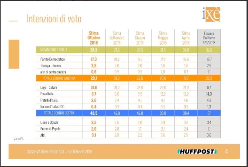 Σύμφωνα με δημοσκόπηση της Ixe Poll για λογαριασμός της Huffington Post, η Λέγκα του Βορρά λαμβάνει στην πρόθεση ψήφου το 31,8% τον Οκτώβριο του 2018 από 31,2% που ήταν τον Σεπτέμβριο του 2018.