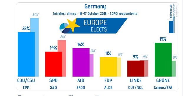 Συγκεκριμένα και σύμφωνα με την εβδομαδιαία δημοσκόπηση «Deutschlandtrend» της Infratest dimap για λογαριασμό του πρώτου καναλιού της γερμανικής τηλεόρασης ARD, Χριστιανοδημοκράτες – Χριστιανοκοινωνιστές (CDU-CSU) λαμβάνουν το 25% με τους Σοσιαλδημοκράτες να βρίσκονται στο 14% και να είναι πλέον τέταρτη πολιτική δύναμη.