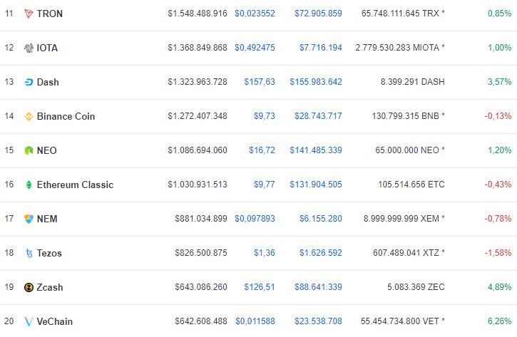 Την ίδια στιγμή, στις 19:10, η υψηλότερη άνοδος εντοπίζεται στα Zcash και XRP (Ripple), ενώ μεταβολή μικρότερη του 1% παρατηρείται στα κρυπτονομίσματα Bitcoin Cash, EOS, Stellar, Litecoin, Tether, Cardano και Monero.