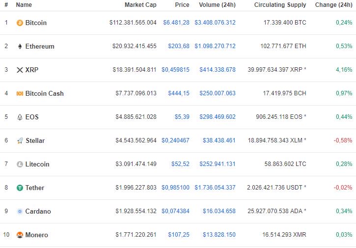Το Bitcoin αδυνατεί να ξεπεράσει τα 6.500 δολάρια ανά μονάδα, με κεφαλαιοποίηση ύψους 112,4 δισεκ. δολαρίων, ενώ το Ethereum διατηρεί οριακά τα 200 δολάρια, με αξία ύψους 20,9 δισεκ. δολαρίων -στην πλατφόρμα «CoinMarketcap».