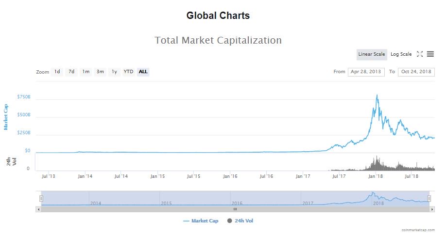 Ελάχιστες διακυμάνσεις παρατηρούνται και σήμερα (24 Οκτωβρίου 2018) στα ψηφιακά νομίσματα, με την αξία του κλάδου να έχει ενισχυθεί λιγότερο από ένα (1) δισεκ. σε ημερήσια βάση, στα 209,9 δισεκ. δολάρια.