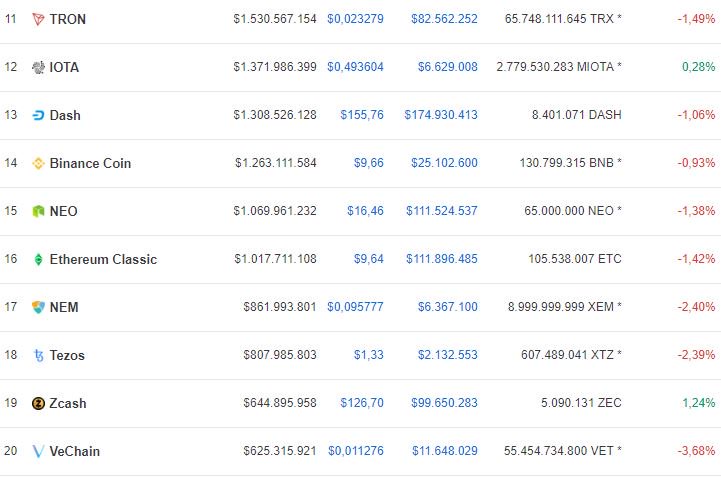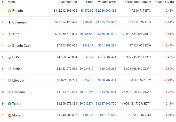 Το Bitcoin δεν καταφέρνει ακόμη να ξεπεράσει τα 6.500 δολάρια ανά μονάδα, στην πλατφόρμα «CoinMarketCap», με κεφαλαιοποίηση 112,2 δισεκ. δολαρίων, έναντι συνολικής αξίας ύψους 208,8 δισεκ. για τον κλάδο.
