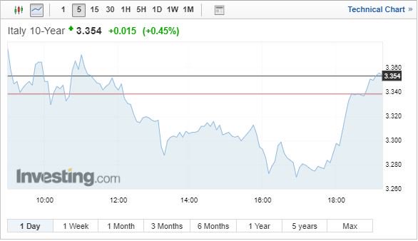 Την ίδια ώρα, η απόδοση του 10ετούς ιταλικού ομολόγου υποχώρησε στο 3,34% από 3,438% στο κλείσιμο της Παρασκευής, σε χαμηλά εβδομάδας.