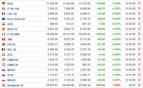 Με ισχυρή άνοδο έκλεισαν σήμερα (29/10/2018) τα κυριότερα ευρωπαϊκά χρηματιστήρια, με τις τράπεζες να πρωταγωνιστούν, λόγω των ισχυρών αποτελεσμάτων που ανακοίνωσε η HSBC.