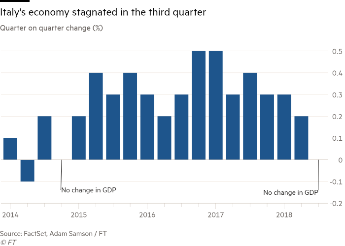 Μετά την ανάπτυξη με ρυθμό 0,2% στο β΄τρίμηνο του 2018, η ιταλική οικονομία παρέμεινε στάσιμη στο γ΄τρίμηνο του έτους,