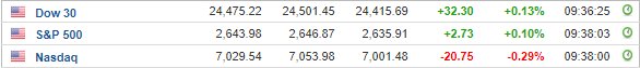 Περί τις 15:30, ο Dow Jones ενισχύεται κατά 0,3% στις 24.506 μονάδες, ο S&P 500 σημειώνει άνοδο 0,4% στις 2.651 μονάδες, ενώ ο Nasdaq κινείται οριακά υψηλότερα, στις 7.053 μονάδες.