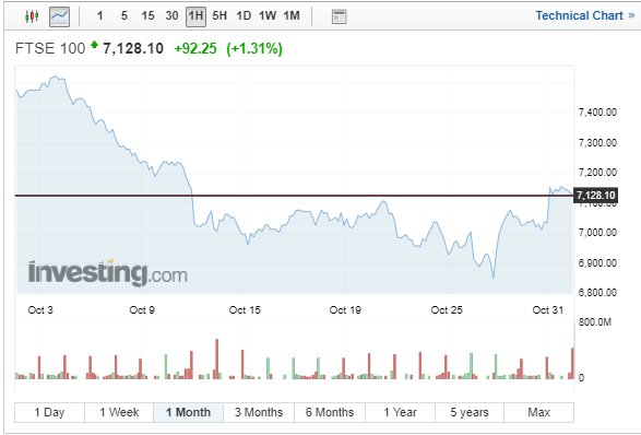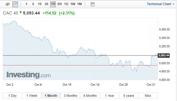Ο FTSE 100 στο Λονδίνο σημείωσε άνοδο 1,31% και ολοκλήρωσε τον μήνα στις 7.128,10 μονάδες, με τις μηνιαίες απώλειες να περιορίζονται στο 5,1%, ενώ ο CAC 40 στο Παρίσι έκλεισε με κέρδη 2,31% στις 5.093,44 μονάδες, χάνοντας το 7,3% της αξίας του τον Οκτώβριο.