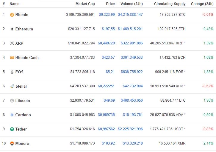 Το δημοφιλέστερο κρυπτονόμισμα διαπραγματεύεται στα 6.324 δολάρια ανά μονάδα, στην πλατφόρμα «CoinMarketCap», με κεφαλαιοποίηση ύψους 109,7 δισεκ. δολαρίων.