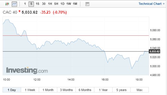 Στη Φρανκφούρτη, ο DAX υποχώρησε κατά 0,52% στις 11.353,67 μονάδες, ενώ ο CAC 40 στο Παρίσι έκλεισε με πτώση 0,70%, στις 5.033,62 μονάδες.
