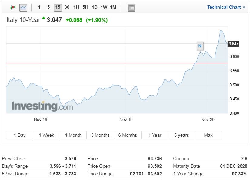 Η απόδοση του 10ετούς ομολόγου ενισχύεται στο 3,647%, με υψηλό ημέρα το 3,711%, από 3,579% στο χθεσινό κλείσιμο.