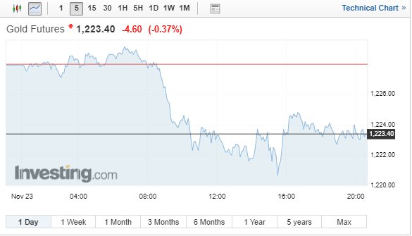 Η τιμή του συμβολαίου του χρυσού παραδόσεως Δεκεμβρίου έκλεισε με απώλειες 0,4% ή 4,80 δολ. στα 1.223,20 δολ. ανά ουγγιά