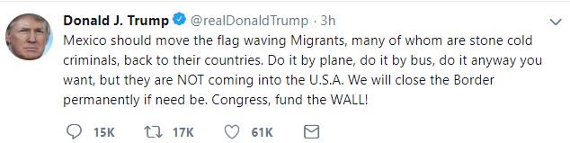 O Αμερικανός πρόεδρος κάλεσε την κυβέρνηση του Μεξικού να στείλει πίσω στις πατρίδες τους, τους μετανάστες που βρίσκονται στα σύνορα με τις ΗΠΑ