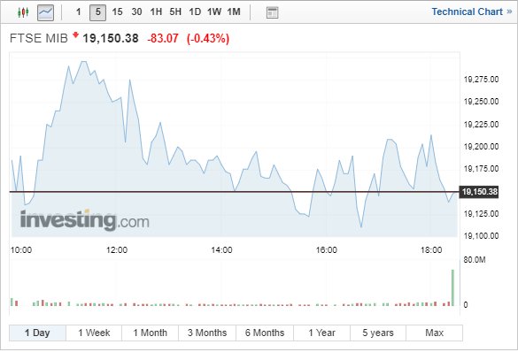 Στο Μιλάνο, ο FTSE MIB υποχώρησε κατά 0,43% κι έκλεισε στις 19.150,38 μονάδες, παρά το γεγονός ότι η ιταλική κυβέρνηση εμφανίζεται έτοιμη να προχωρήσει σε έναν τακτικό συμβιβασμό με τις Βρυξέλλες.