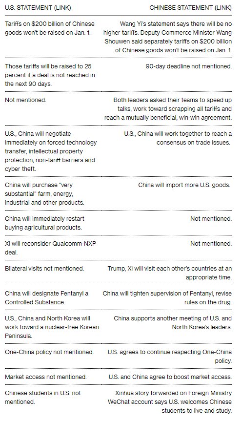 «Οι διαπραγματεύσεις ανάμεσα στις δύο πλευρές θα συνεχιστούν», μετέδωσε το αγγλόφωνο κινεζικό τηλεοπτικό δίκτυο CGTN, αναφερόμενο στη διευθέτηση στην οποία κατέληξαν οι δύο ηγέτες.