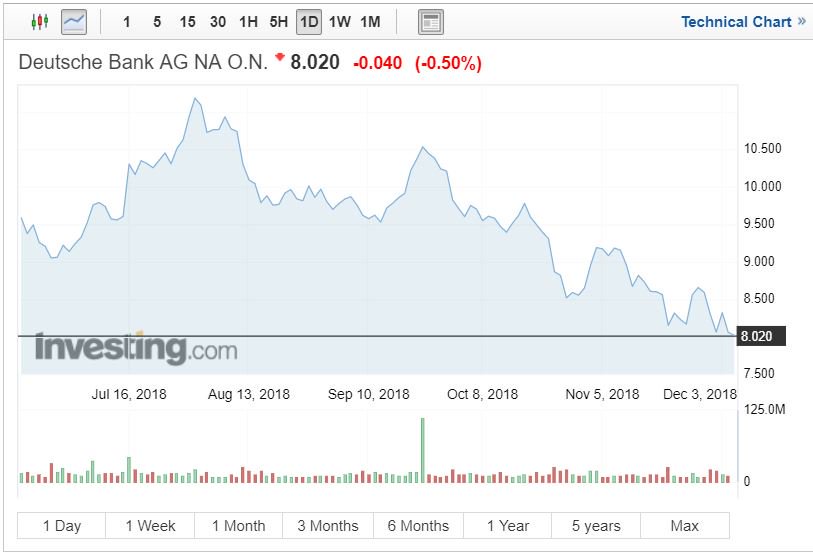 Η μετοχή της μεγαλύτερης γερμανικής τράπεζας υποχώρησε στο ιστορικό χαμηλό των 7,87 ευρώ, ενώ περί τις 11:15 διαπραγματευόταν στα 8 ευρώ με πτώση 0,65%.