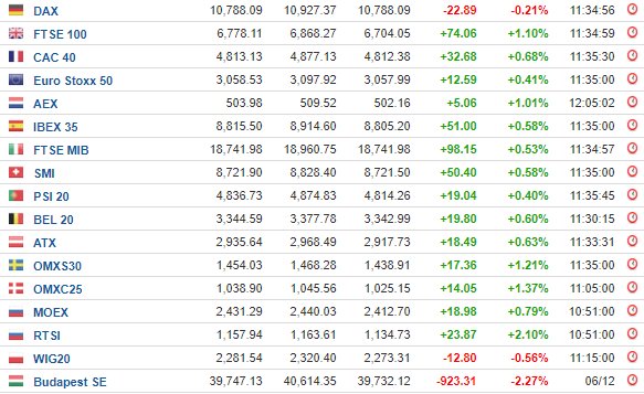 Ο DAX στη Φρανκφούρτη υποχώρησε κατά 0,21% κι έκλεισε στις 10.788,09 μονάδες, ο FTSE 100 στο Λονδίνο σημείωσε άνοδο 1,1% στις 6.778,11 μονάδες, ενώ ο CAC 40 στο Παρίσι έκλεισε με κέρδη 0,68% στις 4.813,13 μονάδες.