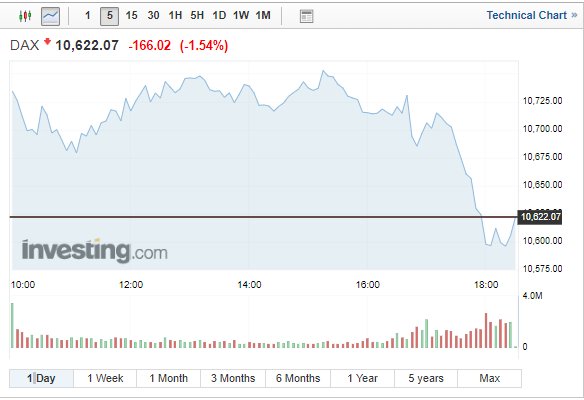 Ο DAX στη Φρανκφούρτη σημείωσε πτώση 1,54% κι έκλεισε στις 10.622,07 μονάδες, ο CAC 40 στο Παρίσι έκλεισε με απώλειες 1,47% στις 4.742,38 μονάδες, ενώ ο FTSE 100 στο Λονδίνο υποχώρησε κατά 0,83% στις 6.721,54 μονάδες.