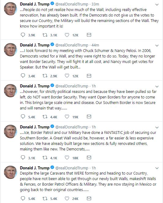 «Εάν οι Δημοκρατικοί δεν μας δώσουν τις ψήφους για να ασφαλίσουμε τη χώρα μας, ο Στρατός θα κατασκευάσει τα εναπομείναντα τμήματα του Τείχους», έγραψε σε ανάρτησή του στο «Twitter» ο Trump.