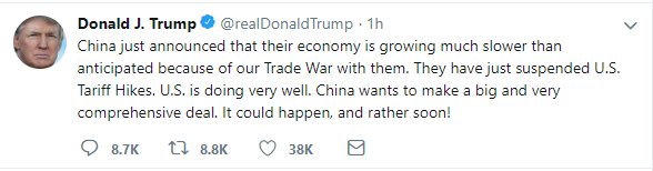 «Η Κίνα μόλις ανακοίνωσε ότι η οικονομία της αναπτύσσεται πολύ πιο αργά από ό,τι αναμενόταν λόγω του εμπορικού μας πολέμου μαζί τους.