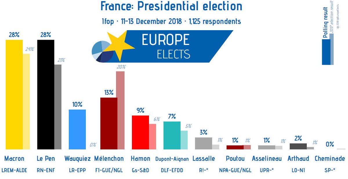 Να σημειωθεί ότι στη δημοσκόπηση η Le Pen λαμβάνει 27% των ψήφων από 21,3% των ψήφων που είχε συγκεντρώσει στις εκλογές στις 23 Απριλίου 2017 ενώ ο Macron είναι στο 25% από 24% που έλαβε πέρυσι.