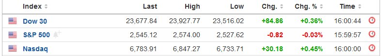 Κέρδη 0,36% για τον Dow Jones στις 23.677 μονάδες, με τον S&P 500 να υποχωρεί οριακά -0,03% στις 2.545 μονάδες και τον Nasdaq να κινείται 0,45% υψηλότερα στις 6.783 μονάδες.