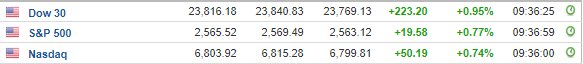 Περί τις 16:30, ο Dow Jones ενισχύεται κατά 0,9% στις 23.814 μονάδες, ο S&P 500 σημειώνει άνοδο 0,8% στις 2.566 μονάδες, ενώ ο Nasdaq κινείται κατά 0,8% υψηλότερα, στις 6.808 μονάδες.