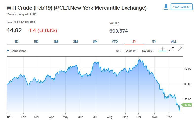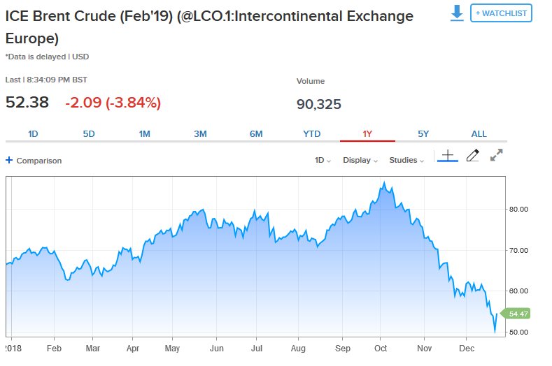 Ειδικότερα, το προθεσμιακό συμβόλαιο για το Brent σημείωσε πτώση της τάξεως του -3,84% στα 52,38 δολ. ανά βαρέλι, ενώ το προθεσμιακό συμβόλαιο Φεβρουαρίου 2019 για το αμερικανικό αργό υποχώρησε κατά -3,03% με την τιμή του να διαμορφώνετα στα 44,82 δολ. ανά βαρέλι.
