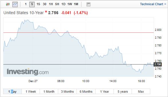 Περί τις 19:45, η απόδοση του 10ετούς ομολόγου των ΗΠΑ σημειώνει πτώση 4 μονάδων βάσης, στο 2,76%, από 2,797% στο χθεσινό κλείσιμο.