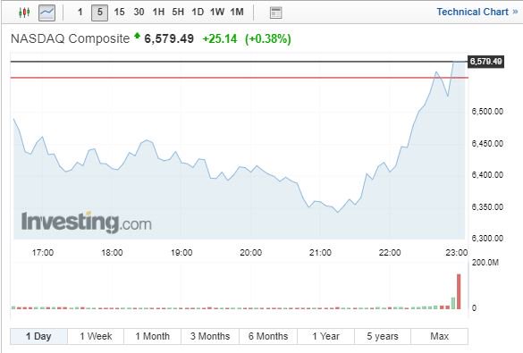 Ο Nasdaq έκλεισε κατά 0,38% υψηλότερα στις 6.579,49 μονάδες, ενώ ενδοσυνεδριακά είχε καταγράψει βουτιά μεγαλύτερη του 3%.