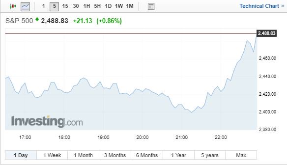 Ο Dow Jones ενισχύθηκε κατά 1,14% κι έκλεισε στις 23.138,82 μονάδες, εώ ο S&P 500 έκλεισε με κέρδη 0,86% στις 2.488,83 μονάδες, με τους δύο δείκτες να καταγράφουν νωρίτερα απώλειες άνω του 2,5%.