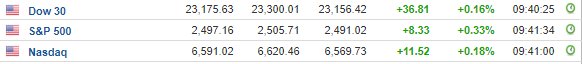 Περί τις 16:30, ο Dow Jones σημειώνει άνοδο 0,2% στις 23.201 μονάδες, ο S&P 500 ενισχύεται κατά 0,3% στις 2.502 μονάδες, ενώ ο Nasdaq κινείται κατά 0,24% υψηλότερα στις 6.339 μονάδες.
