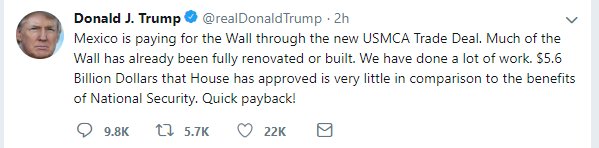 Τα 5,6 δισ. δολ. που ενέκρινε η Βουλή των Αντιπροσώπων είναι πολύ λίγα σε σχέση με τα οφέλη για την Εθνική Ασφάλεια», ανέφερε με ανάρτησή του στο «Twitter» ο Trump.