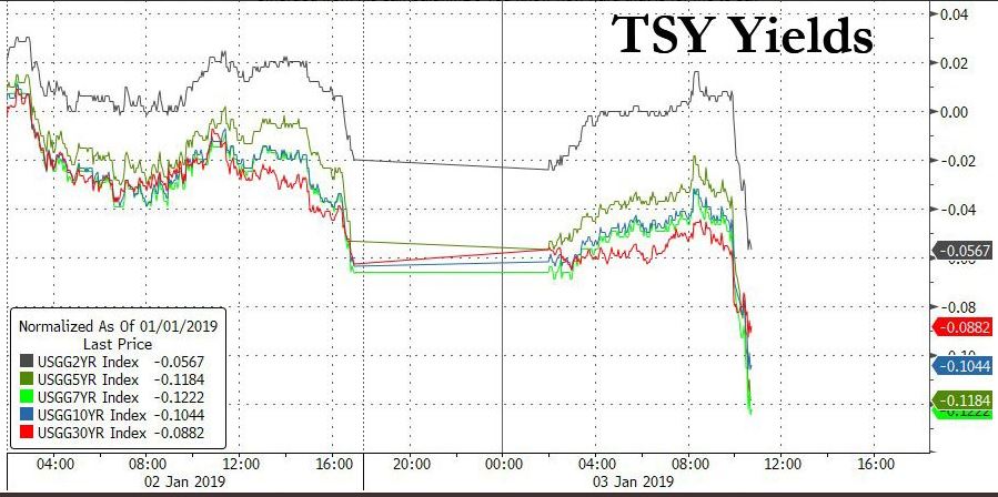 Βουτιά καταγράφουν σήμερα (3/1/2019) οι αποδόσεις των κρατικών ομολόγων των ΗΠΑ, καθώς η υποβάθμιση των εκτιμήσεων της Apple για τα έσοδα α’ τριμήνου 2019 ενέτεινε τις ανησυχίες για μια επιβράδυνση της παγκόσμιας ανάπτυξης, επηρεάζοντας αρνητικά το κλίμα στις αγορές διεθνώς και στρέφοντας τους επενδυτές στα πιο ασφαλή καταφύγια.