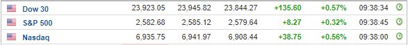 Περί τις 16:30, ο Dow Jones σημειώνει άνοδο 0,5% στις 23.909 μονάδες, ο S&P 500 ενισχύεται κατά 0,3% στις 2.583 μονάδες, ενώ ο Nasdaq κινείται κατά 0,4% υψηλότερα στις 6.929 μονάδες.