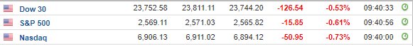 Περί τις 16:30, ο Dow Jones υποχωρεί κατά 0,5% στις 23.763 μονάδες, ο S&P 500 σημειώνει πτώση 0,7% στις 2.568 μονάδες, ενώ ο Nasdaq καταγράφει απώλειες 0,8% στις 6.902 μονάδες.