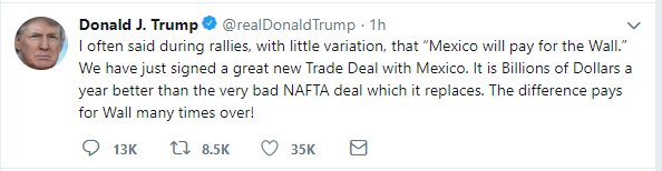 Ο Trump επαναλαμβάνει ότι το Μεξικό θα πληρώσει για την ανέγερση του τείχους, μέσω της νέας εμπορικής συμφωνίας.
