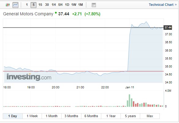 «Άλμα» άνω του 7% καταγράφει σήμερα (11/1/2019) η μετοχή της General Motors Co., καθώς η αμερικανική εταιρεία εξέδωσε μια ισχυρή πρόβλεψη κερδοφορίας για το 2019, χάρη στην ανανεωμένη και άκρως κερδοφόρα σειρά pickup της.