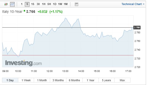 Περί τις 17:15, η απόδοση του ιταλικού 10ετούς ομολόγου σημειώνει άνοδο 3 μονάδων βάσης, στο 2,77%, από 2,734% στο προηγούμενο κλείσιμο.