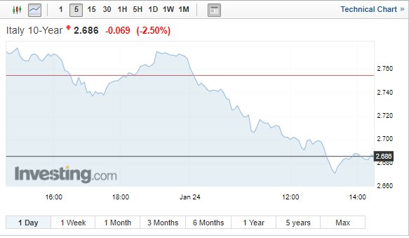 Η απόδοση του ιταλικού 10ετούς ομολόγου διαμορφώθηκε στο 2,68%, από 2,755% στο προηγούμενο κλείσιμο.
