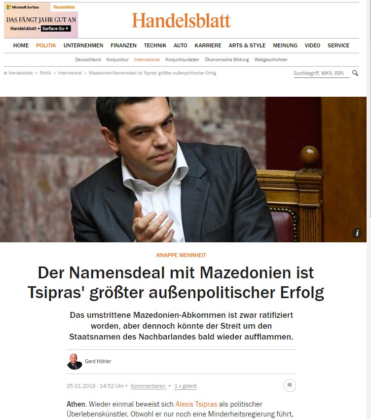 «Η συμφωνία με τη Μακεδονία για την ονομασία είναι η μεγαλύτερη επιτυχία εξωτερικής πολιτικής του Τσίπρα», είναι ο τίτλος άρθρου γνώμης της εφημερίδας «Handelsblatt» για την κύρωση της Συμφωνίας των Πρεσπών, το οποίο αναρτήθηκε λίγη ώρα μετά την ολοκλήρωση της ψηφοφορίας στην Βουλή των Ελλήνων.