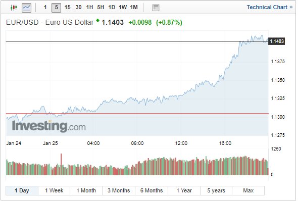 Το ευρώ ενισχύεται κατά 0,9% έναντι του δολαρίου, στο 1,141 δολ., ενώ η στερλίνα σημειώνει άνοδο 0,9% σε σχέση με το αμερικανικό νόμισμα, στο 1,318 δολ.