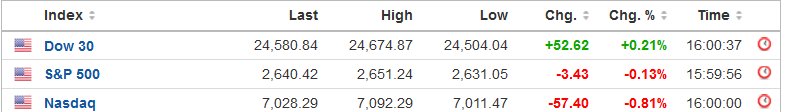 Κέρδη 0,21% σημείωσε ο Dow Jones ο οποίος διαμορφώθηκε στις 24.580 μονάδες, με τον S&P 500 να υποχωρεί 0,13% στις 2.640 μονάδες και τον Nasdaq να δέχεται ισχυρότερες πιέσεις, με απώλειες 0,81% στις 7.028 μονάδες.