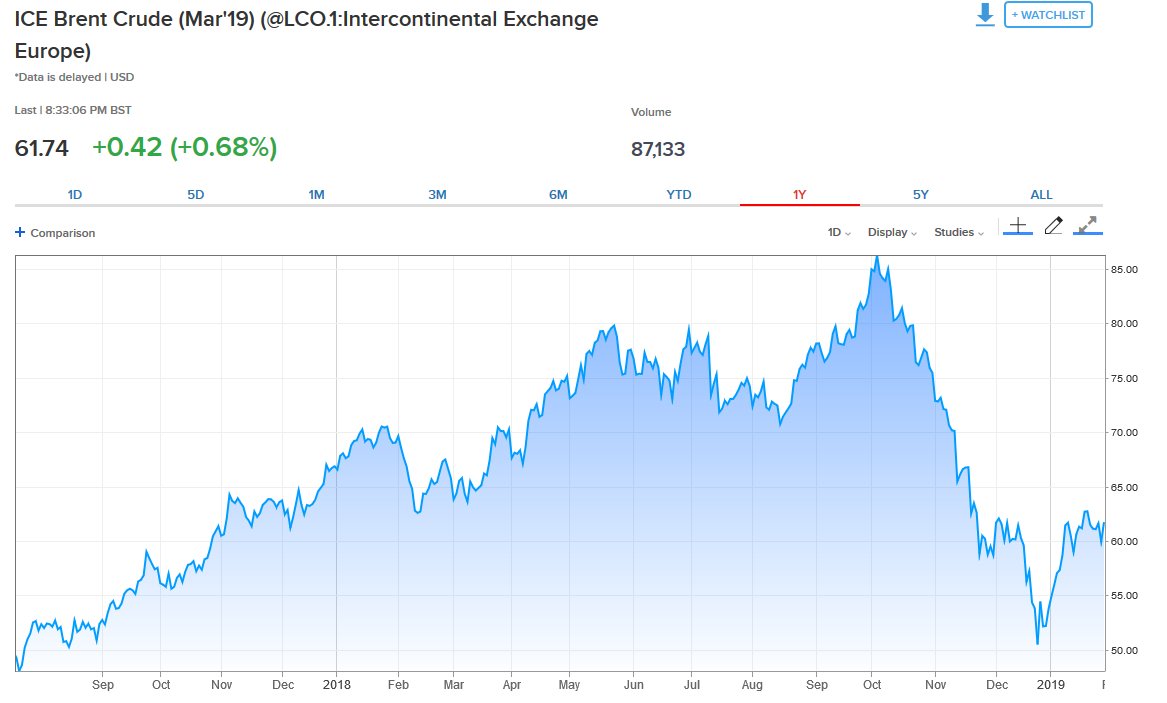 Ειδικότερα, το προθεσμιακό συμβόλαιο Μαρτίου 2019 για το Brent είχε άνοδο της τάξεως του +0,68% στα 61,74 δολ. ανά βαρέλι, την ίδια στιγμή που το προθεσμιακό συμβόλαιο Φεβρουαρίου 2019 για το αμερικανικό αργό ενισχύθηκε +1,73% με την τιμή του να διαμορφώνεται στα 54,23 δολ. ανά βαρέλι.