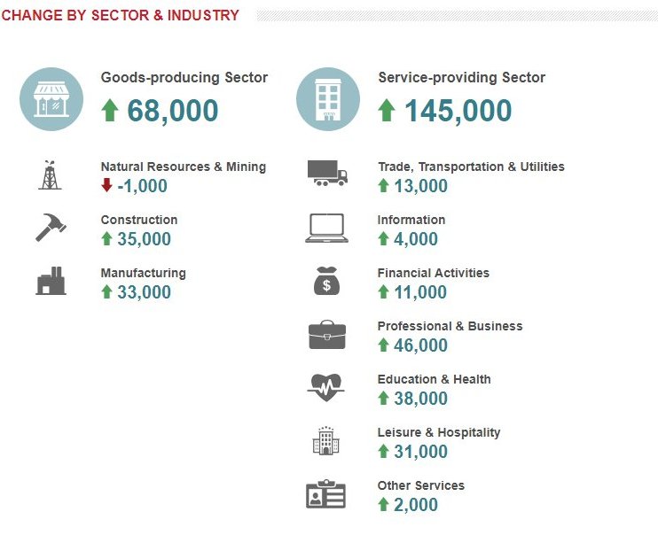 Σύμφωνα με την έκθεση της ADP, μεγάλη αύξηση κατέγραψαν οι τομείς της κατασκευής (+35.000) και της μεταποίησης (+33.000), με τον τελευταίο να σημειώνει τη μεγαλύτερη αύξηση από το 2012, ενώ η μόνη μείωση, κατά 1.000 θέσεις, καταγράφηκε στον κλάδο εξόρυξης.