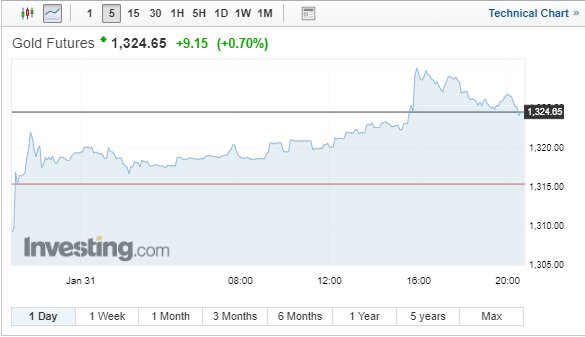 Με σημαντική άνοδο έκλεισε σήμερα (31/1/2019) ο χρυσός, στον απόηχο των χθεσινών αποφάσεων της Federal Reserve, παραμένοντας πάνω από τη ζώνη των 1.300 δολ. ανά ουγγιά για πέμπτη συνεχόμενη ημέρα.