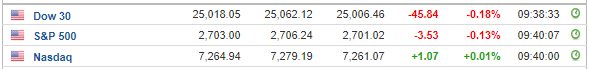 Περί τις 16:30, ο Dow Jones υποχωρεί κατά 0,1% στις 25.039 μονάδες, ο S&P 500 σημειώνει πτώση 0,1% στις 2.705 μονάδες, ενώ ο Nasdaq κινείται κατά 0,1% υψηλότερα στις 7.274 μονάδες.