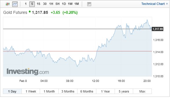 Η τιμή του συμβολαίου Απριλίου έκλεισε σήμερα με άνοδο 0,3% ή 4,30 δολ. στα 1.318,50 δολ. ανά ουγγιά.
